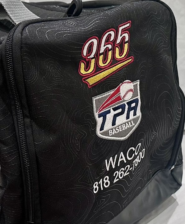 Rawlings Hybrid Mach Duffle. Backpack / Duffel Hybrid – 2 Bat Sleeves and Custom Embroidery